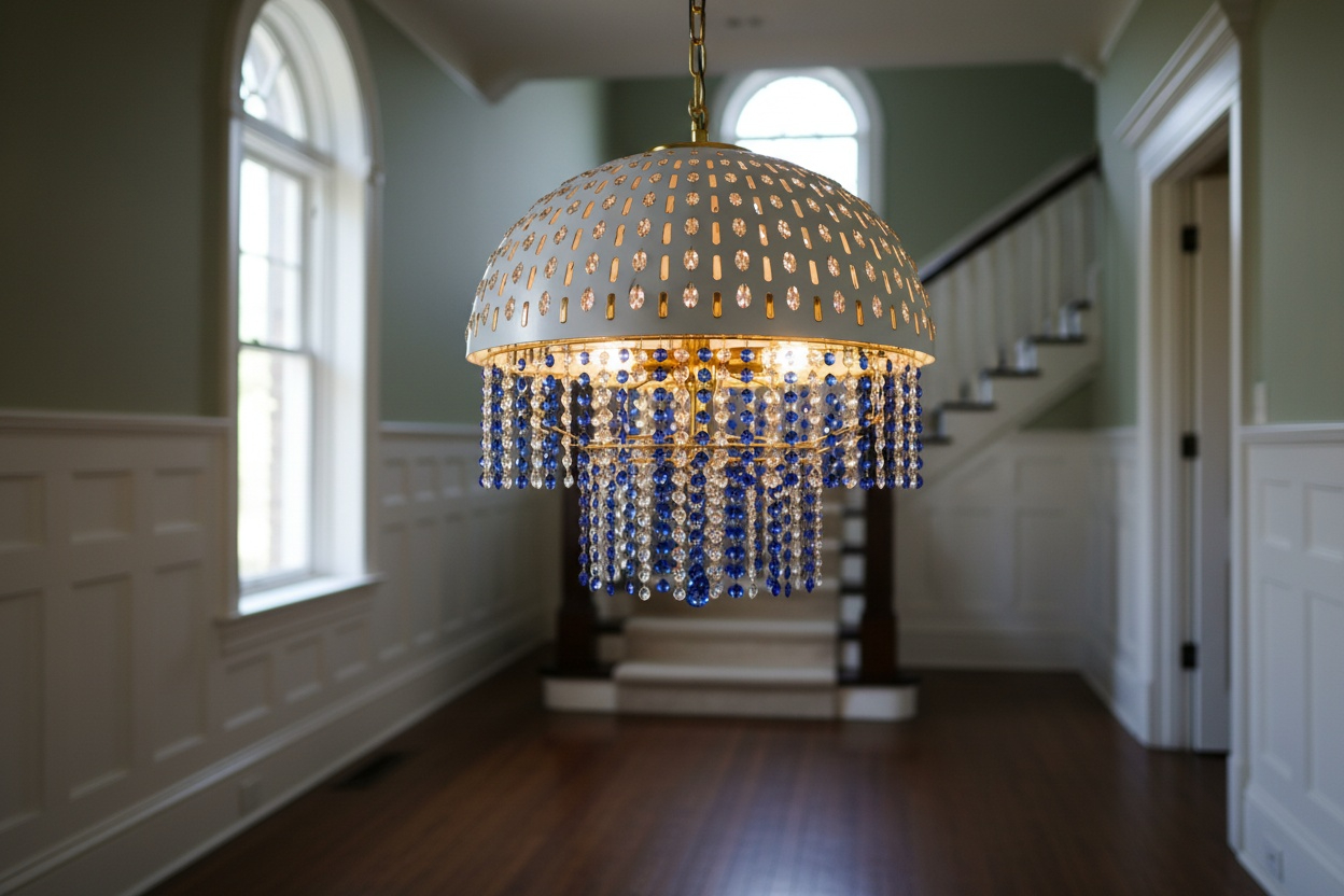 Elevate your home with the Blue Cascade Crystal Dome Chandelier—a statement piece that radiates style and quality. Available exclusively at Luxury Light Company.