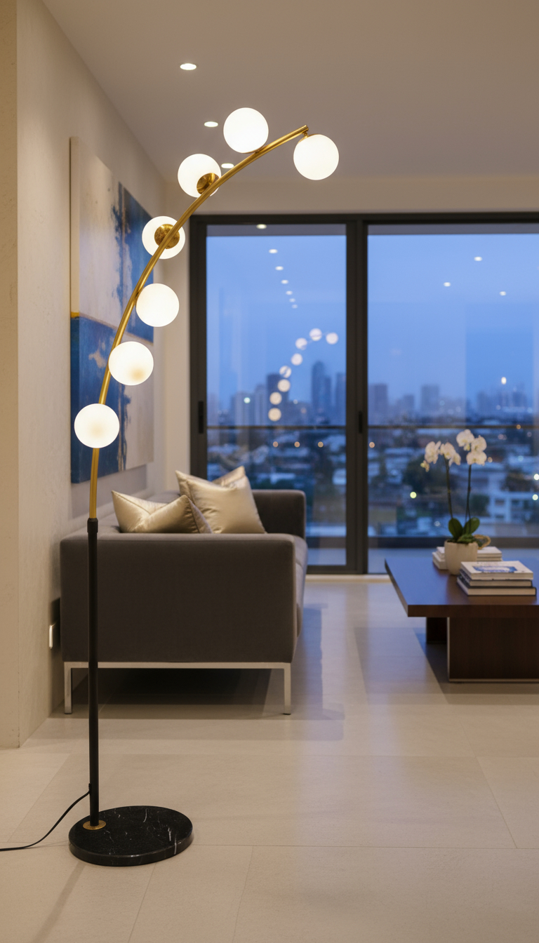 Elevate your living space with the Celeste Arc Floor Lamp from LuxuryLights, where modern design meets timeless elegance. This striking piece features a sleek, arched silhouette adorned with six luminous globe lights, creating a harmonious blend of contemporary sophistication and warm ambiance. Perfect for living rooms, bedrooms, or office spaces, it’s a statement of style and functionality.