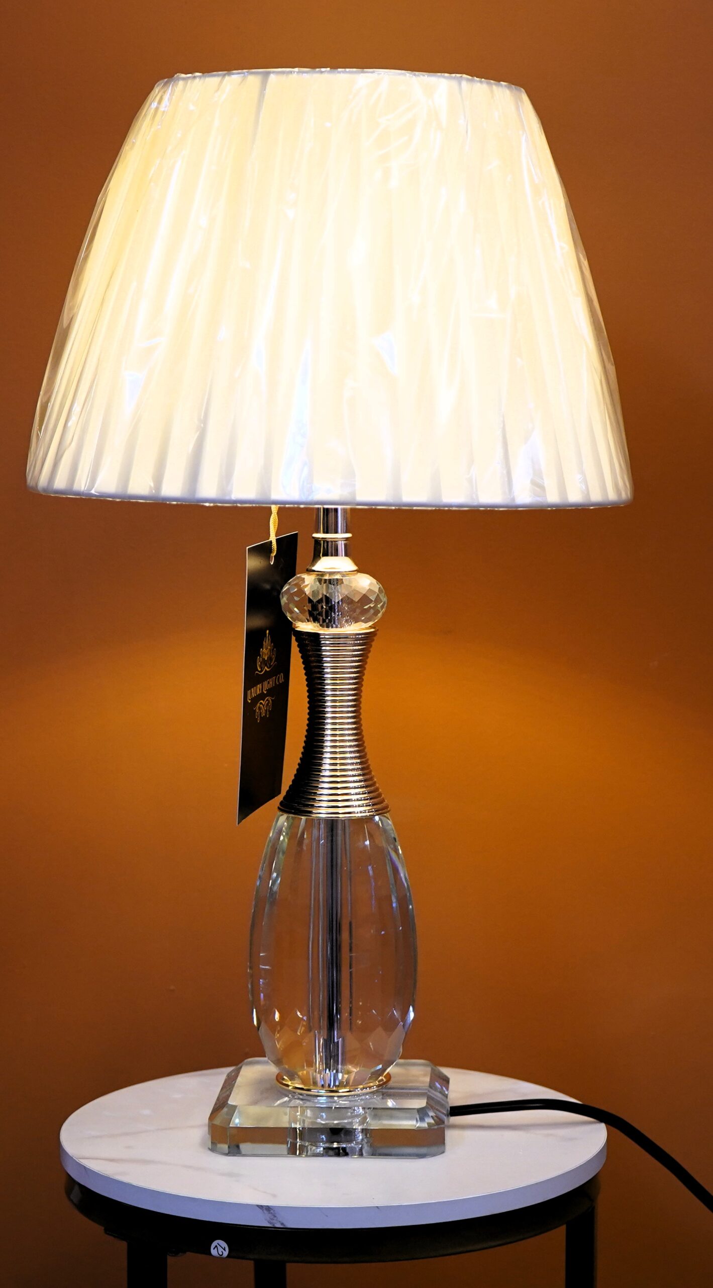 Elevate your living space with the exquisite Gold-Tipped Crystal Lamp from LuxuryLights, a masterpiece of elegance and functionality. Featuring a stunning crystal base adorned with luxurious gold accents, this lamp is paired with a pleated ivory shade that diffuses light beautifully to create a warm, inviting ambiance.