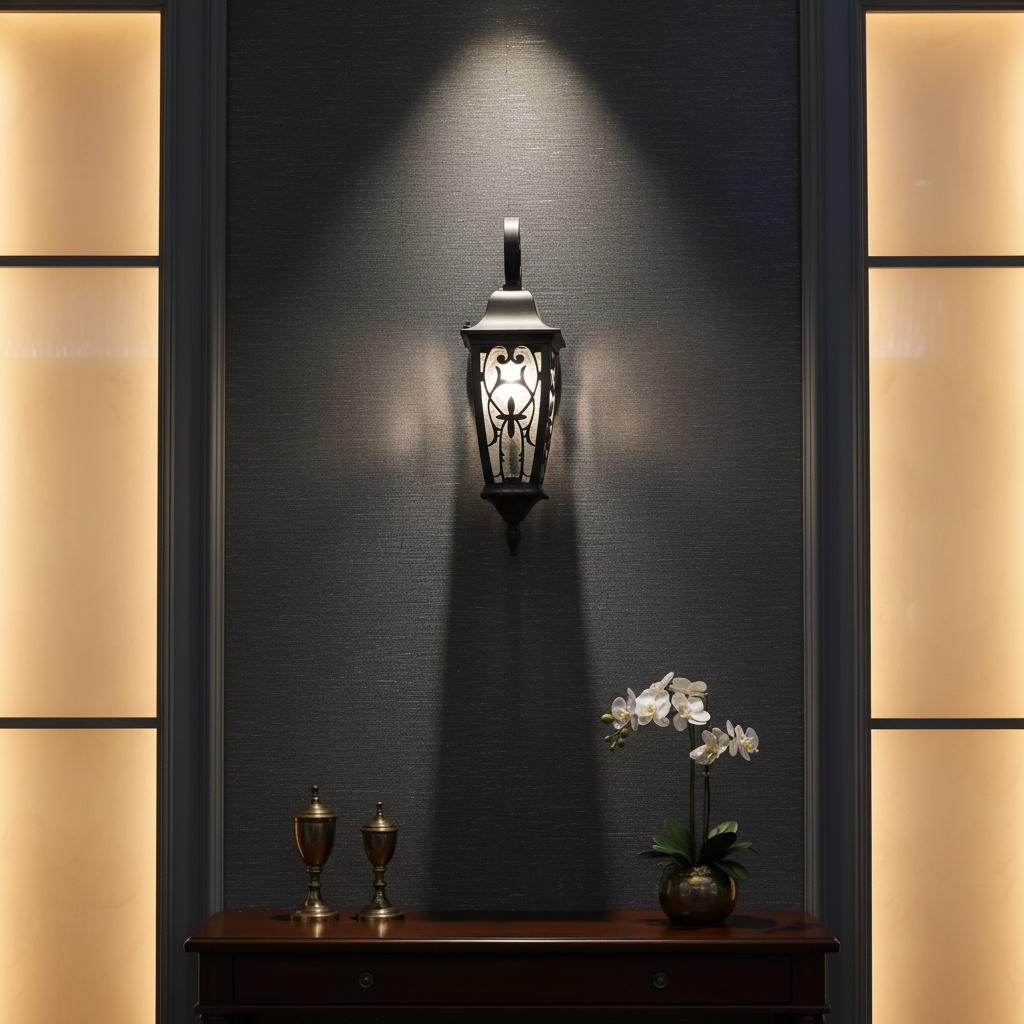 Marseille Scroll Wall Lantern – Black Cast Iron & Frosted Glass
