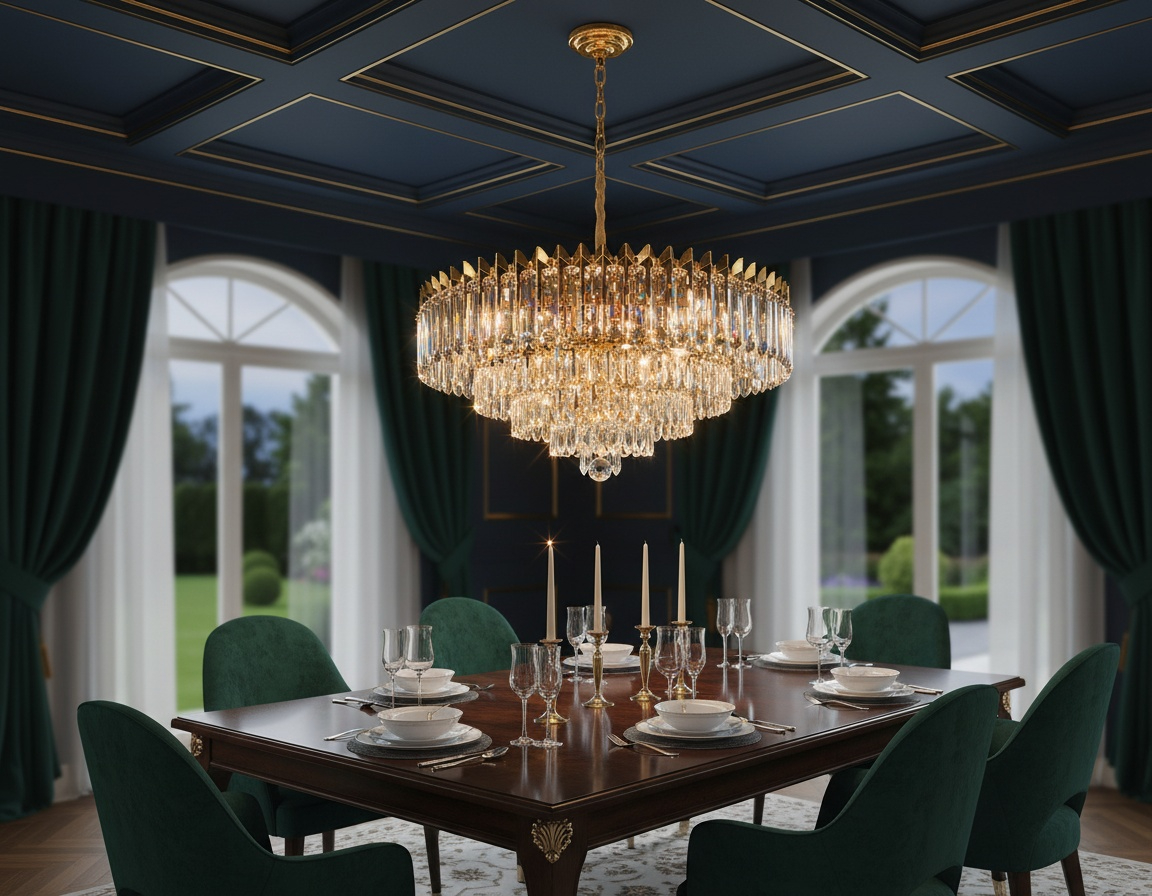 Adorned with meticulously arranged crystal prisms, it casts a breathtaking cascade of light, transforming any room into a grandiose setting. Ideal for dining rooms, living areas, or entryways, this chandelier is more than just lighting—it’s a statement piece that redefines ambiance.